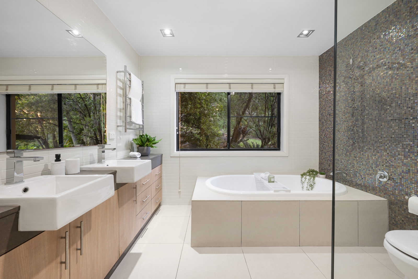 • Stylish main bathroom with twin vanity, shower, bath and toilet
