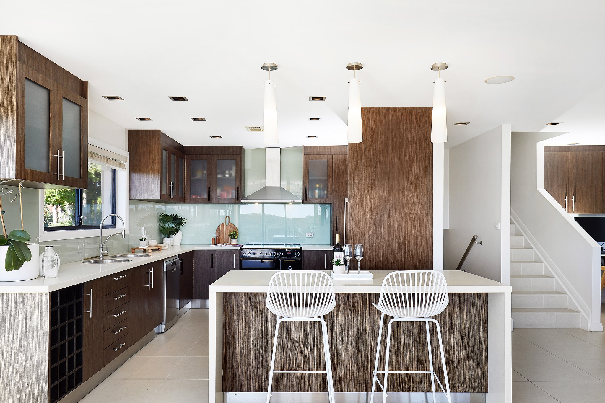 • Modern open plan kitchen with island bench, breakfast bar, Caesarstone benchtops, Premium