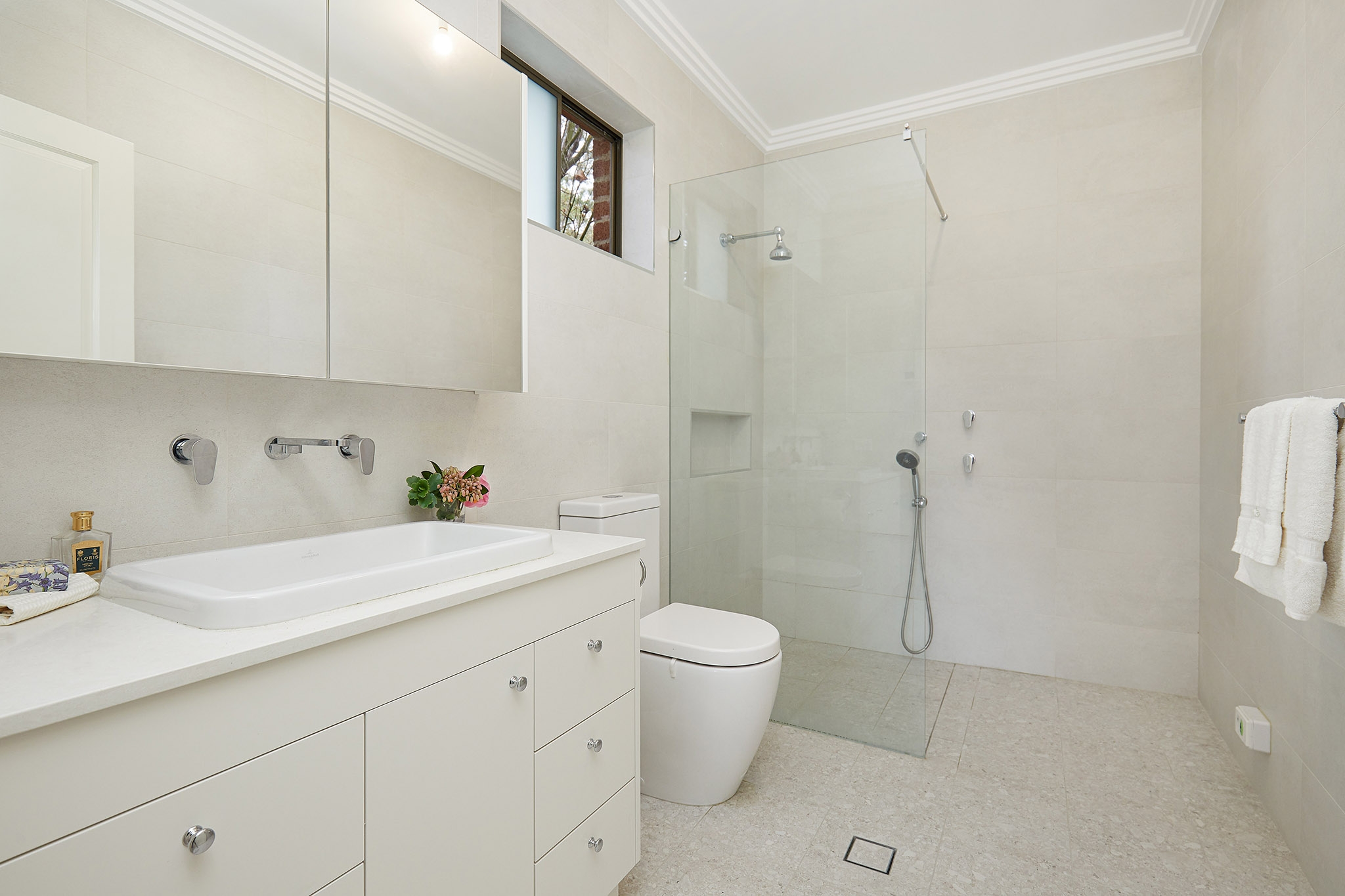 • Skylit main bathroom incorporates European laundry